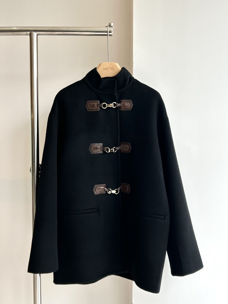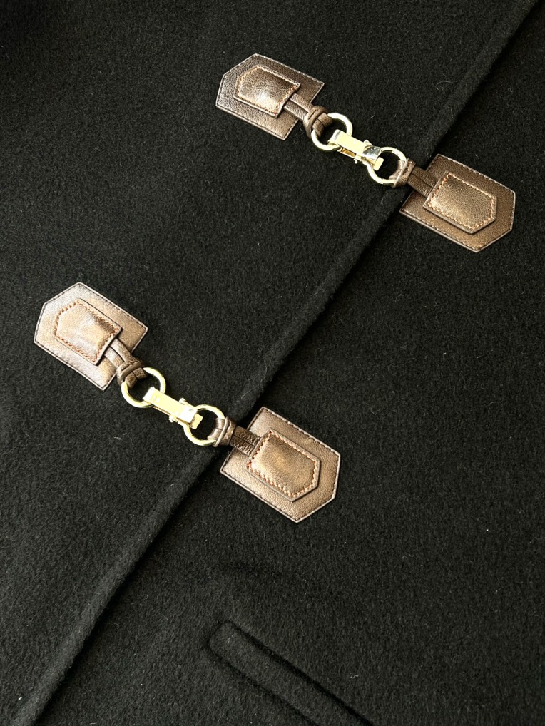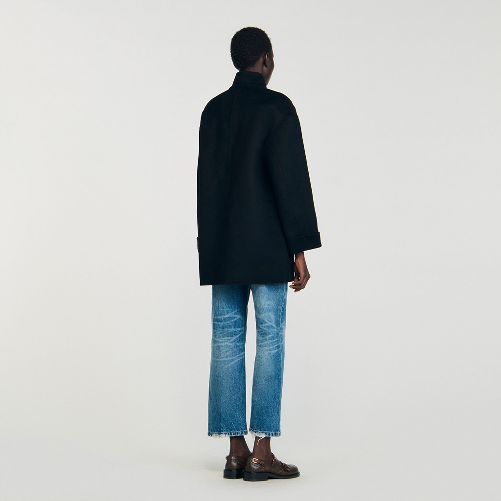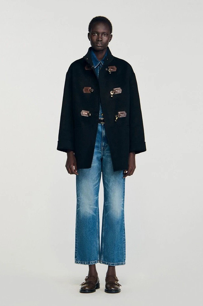 Áo dạ SANDRO đen khuy móc da nâu