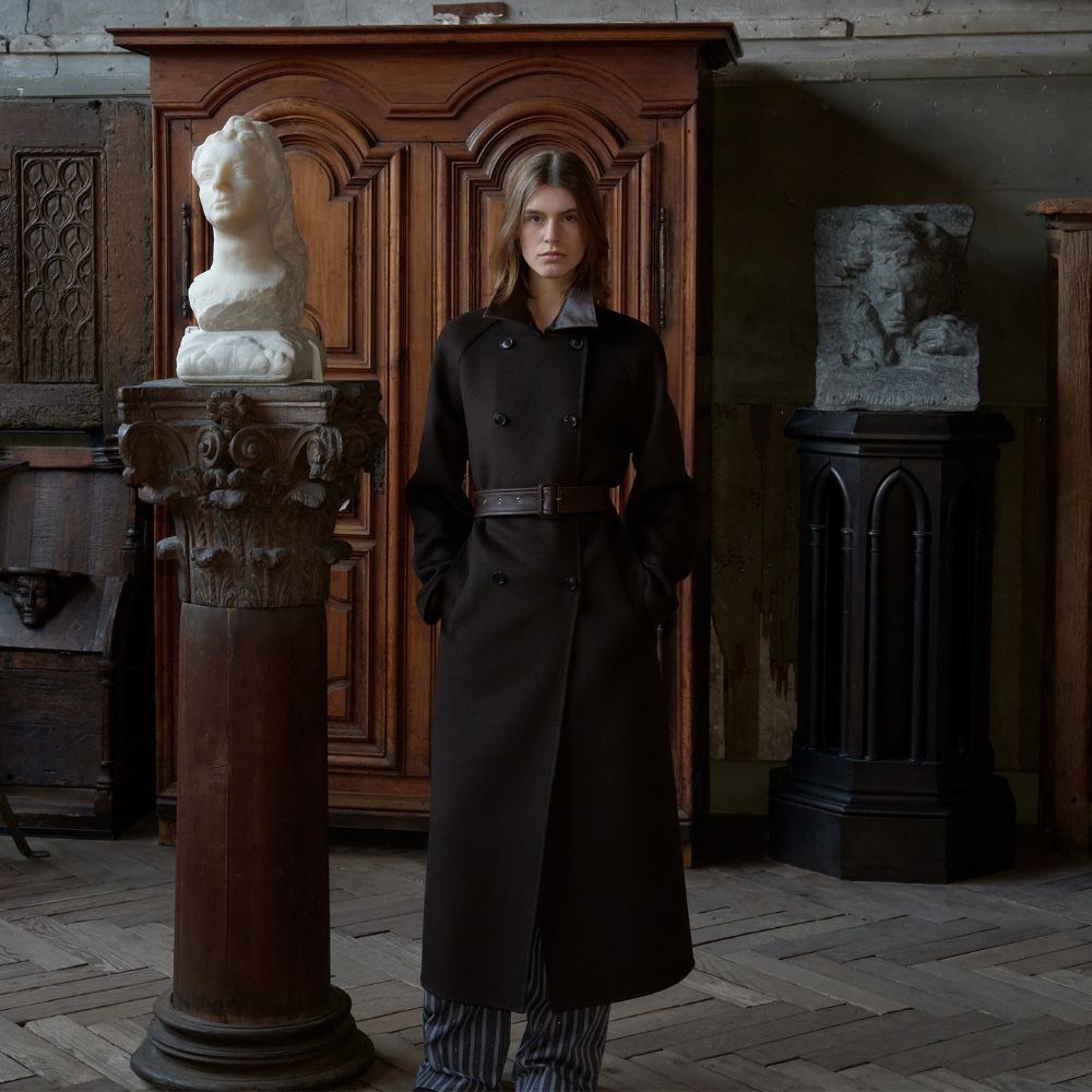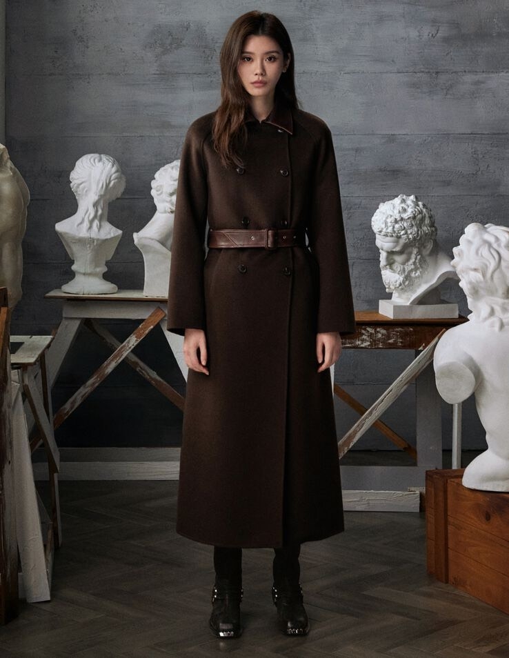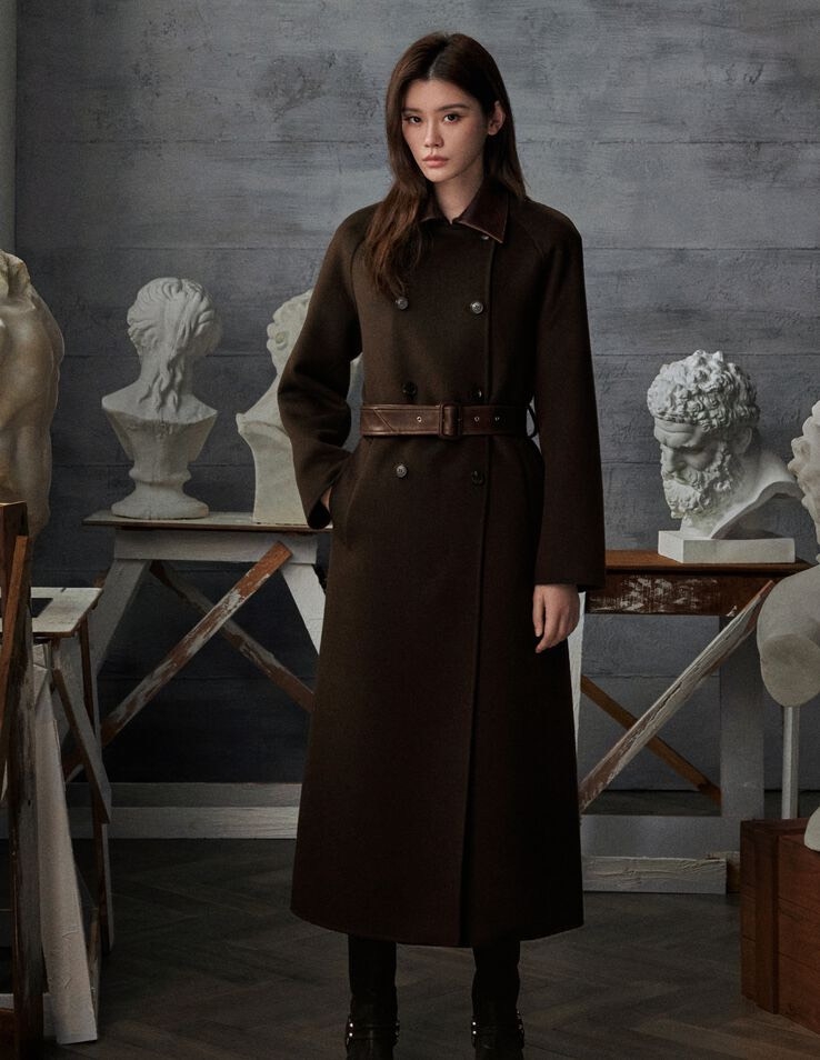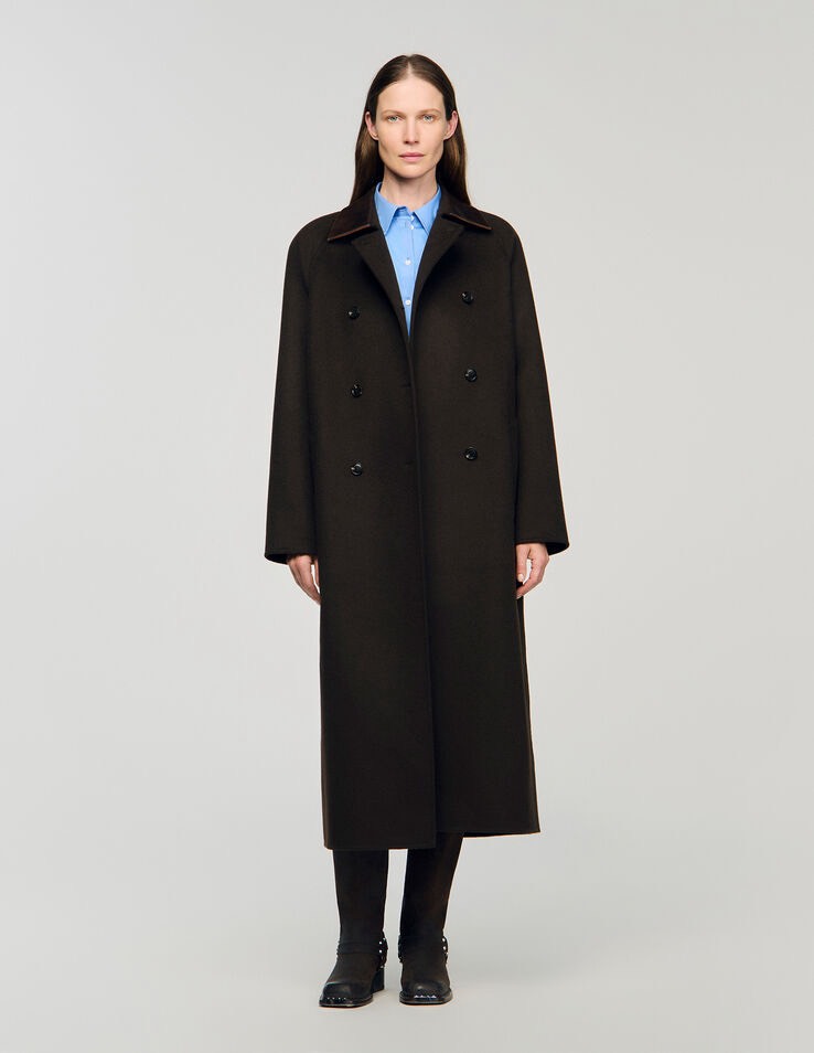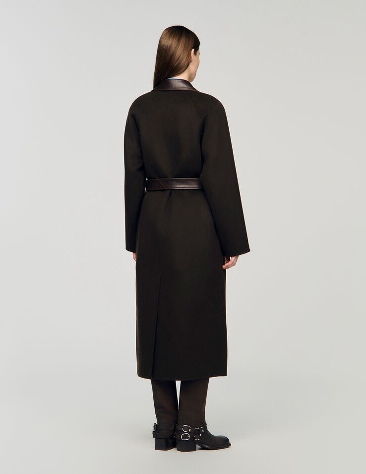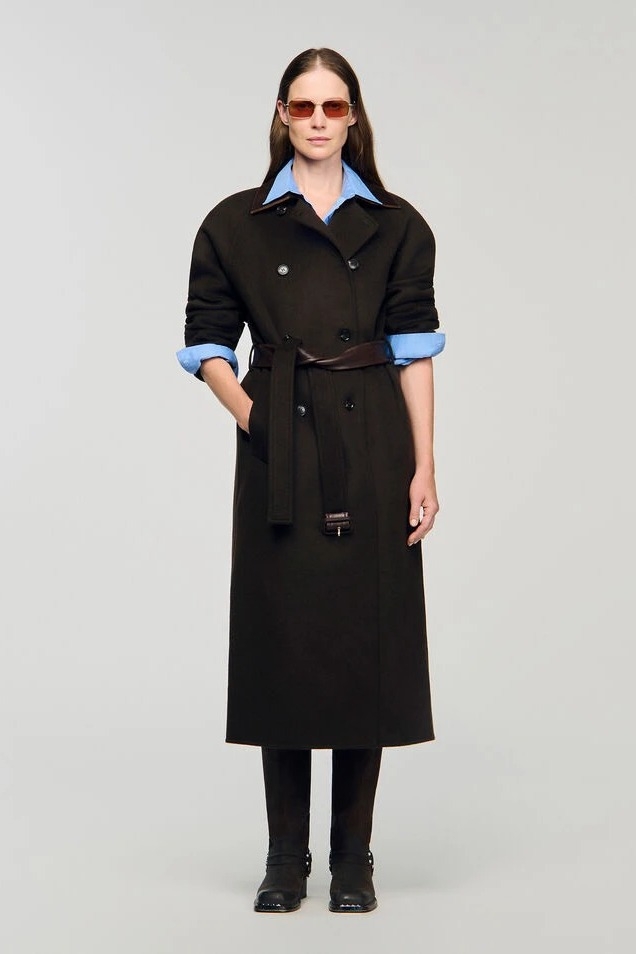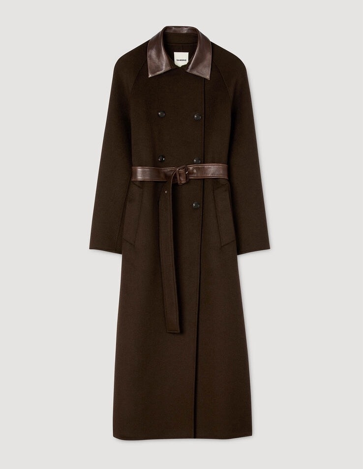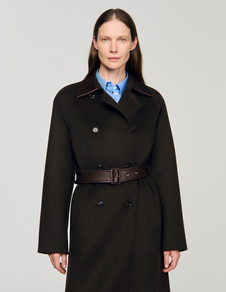 Áo dạ SANDRO nâu cổ da dáng dài kèm belt