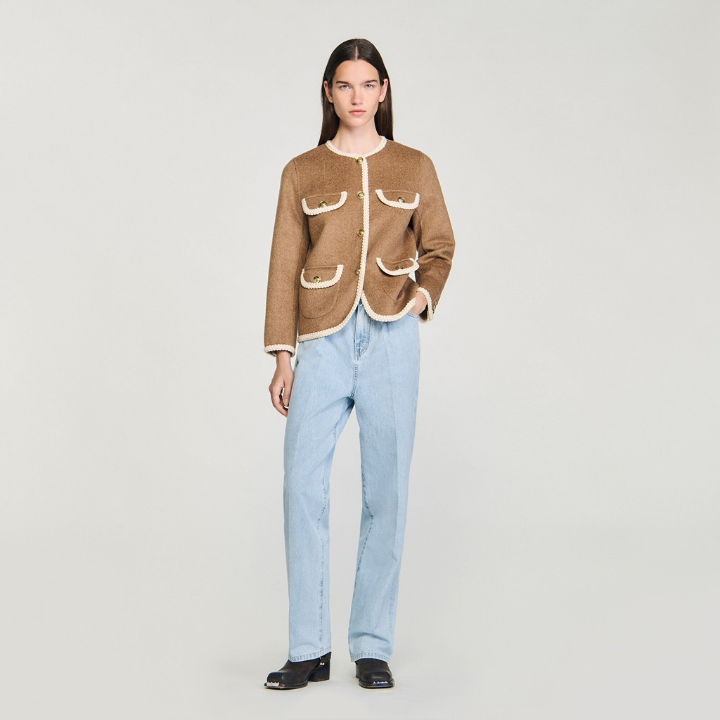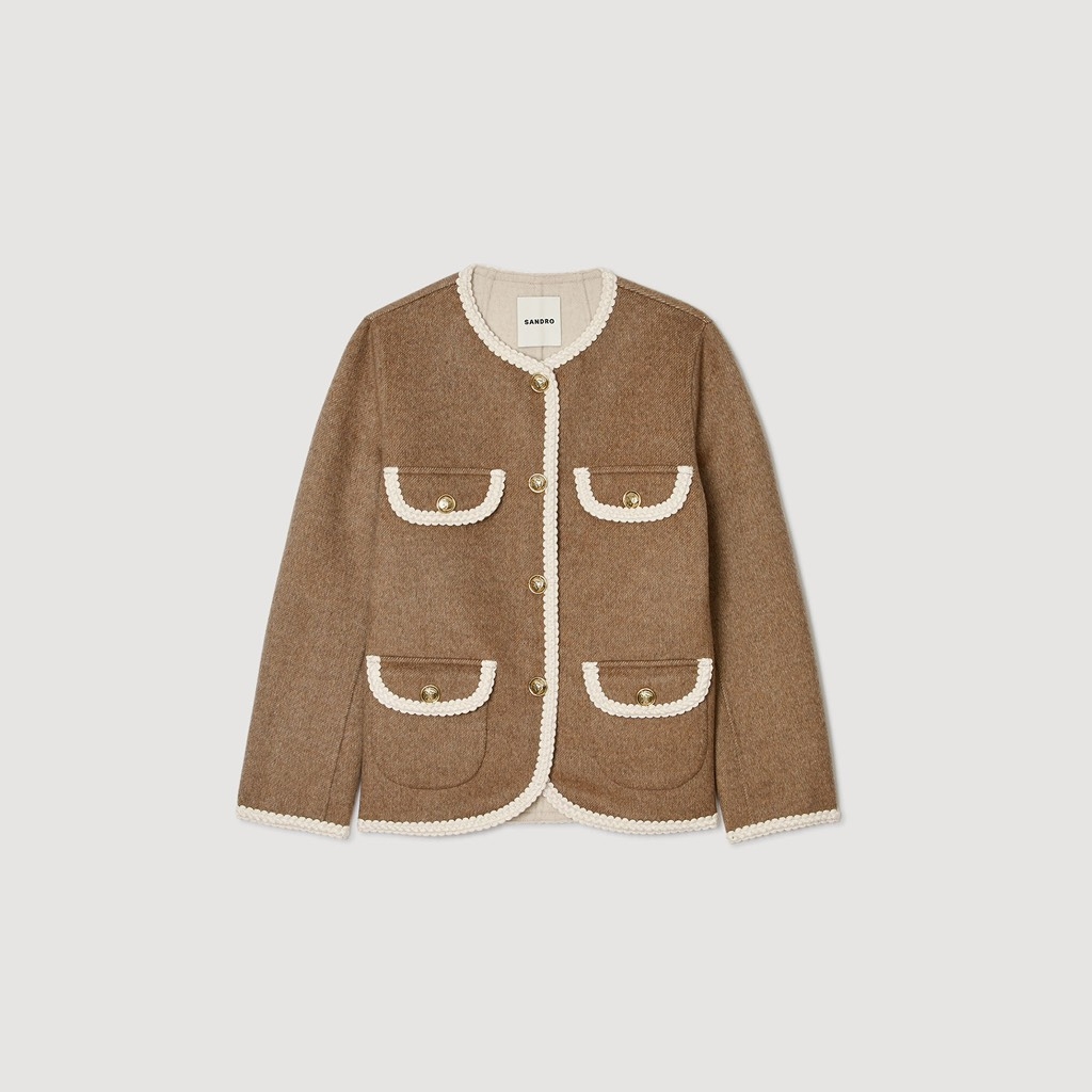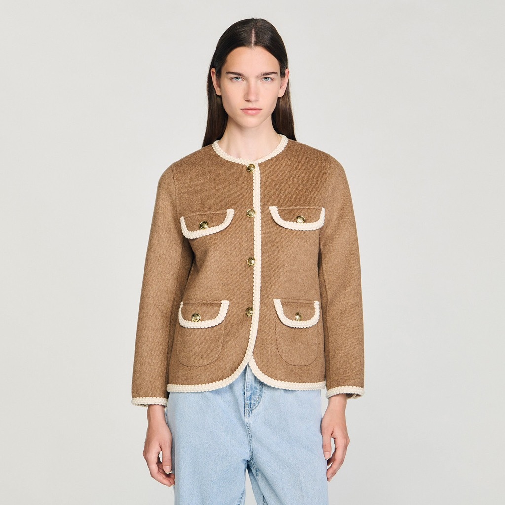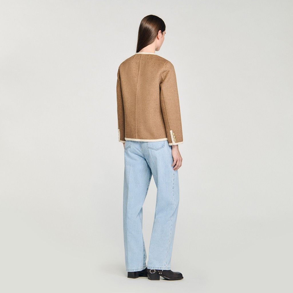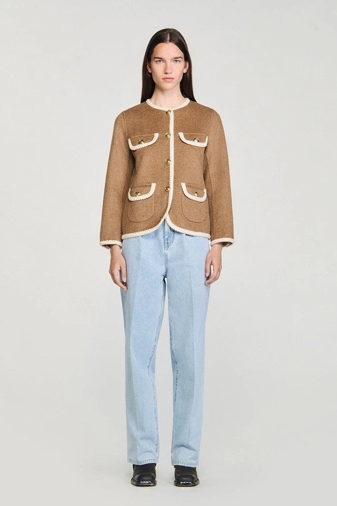 Áo khoác SANDRO nâu cổ lông siêu nhẹ