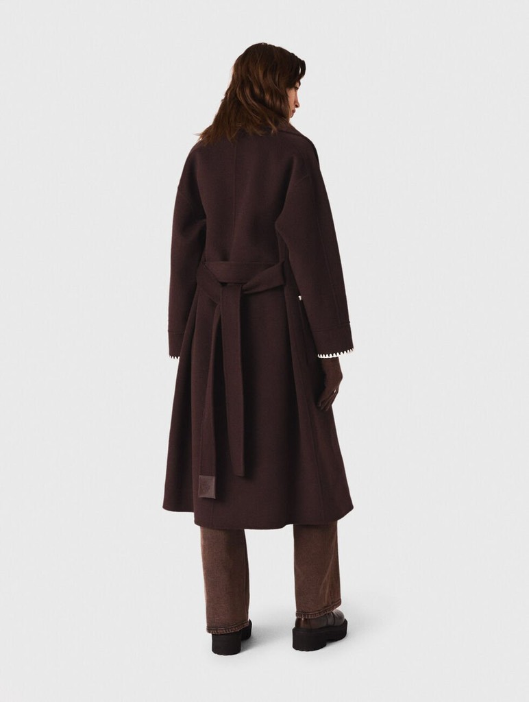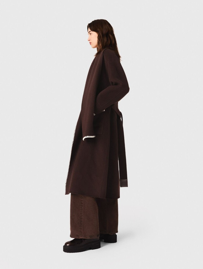 Áo dạ SANDRO nâu cổ da dáng dài kèm belt
