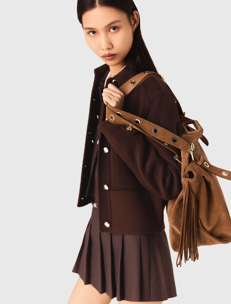 Áo SANDRO nâu cổ cải da túi 2 bên