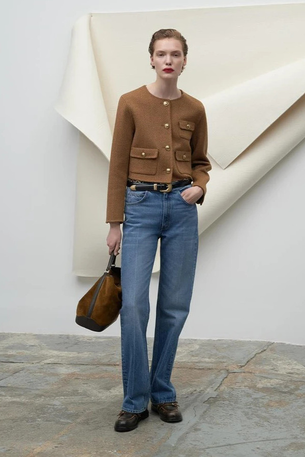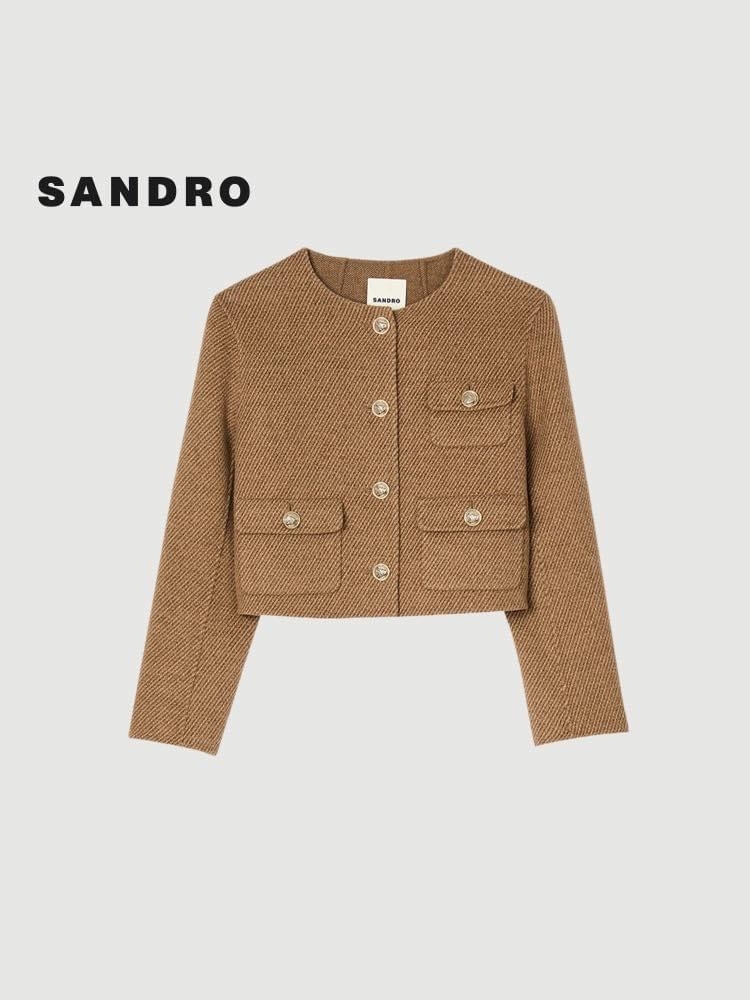 Áo SANDRO nâu cổ cải da túi 2 bên