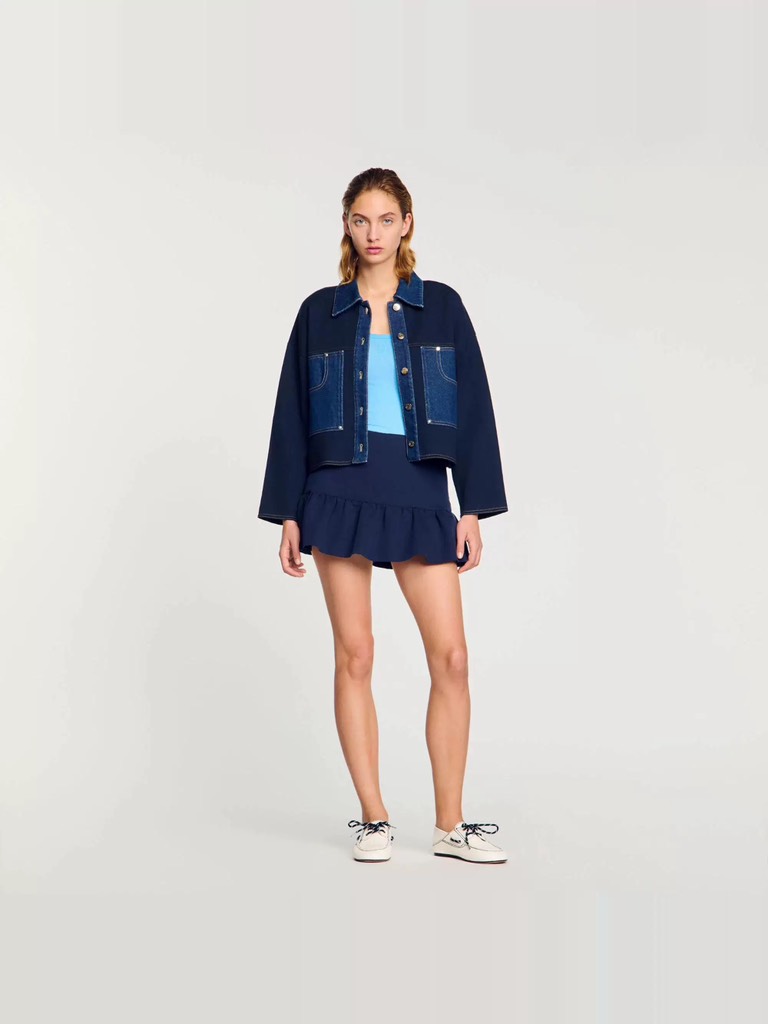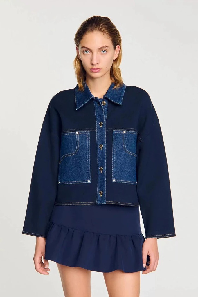 Áo SANDRO nâu cổ cải da túi 2 bên