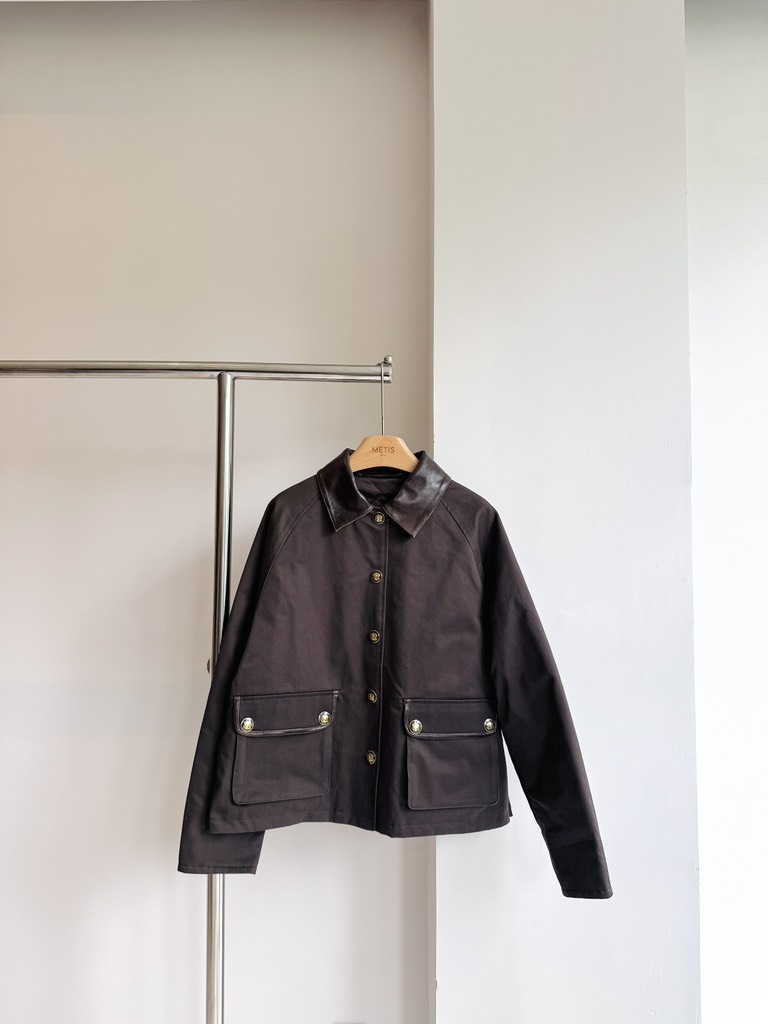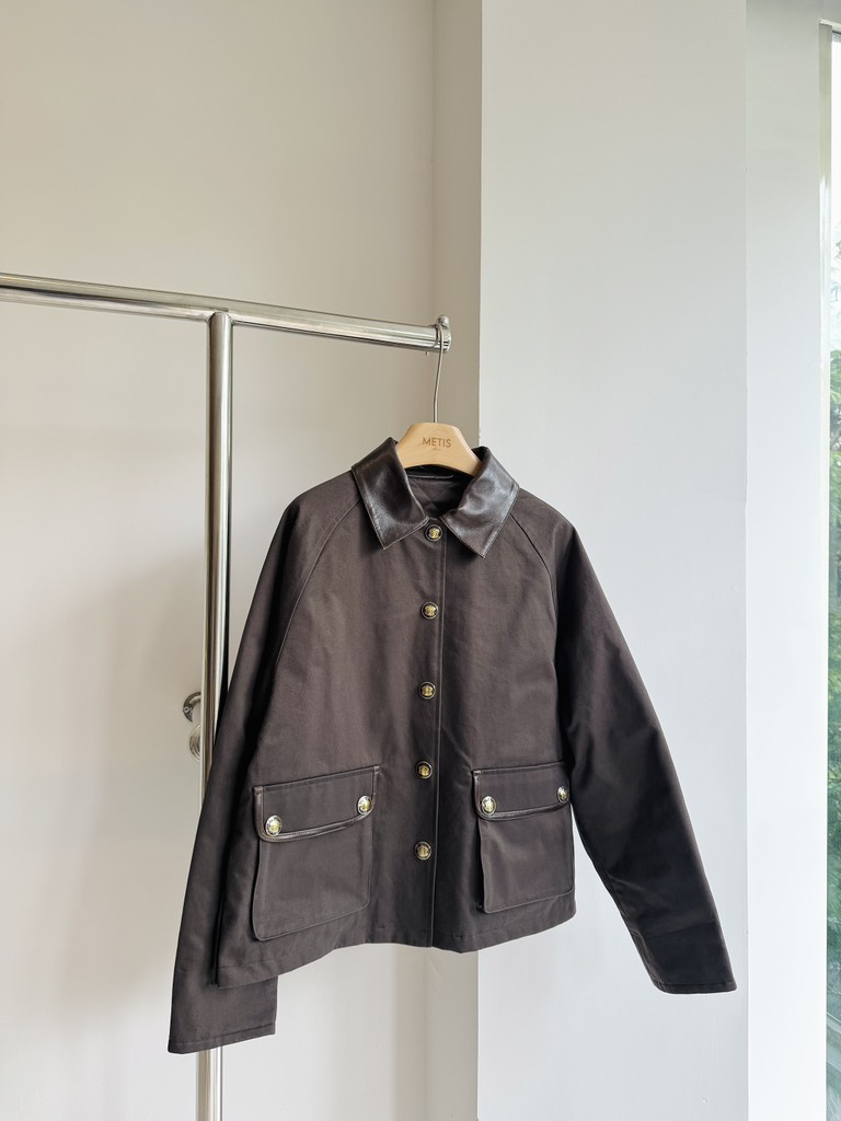 Áo SANDRO nâu cổ cải da túi 2 bên