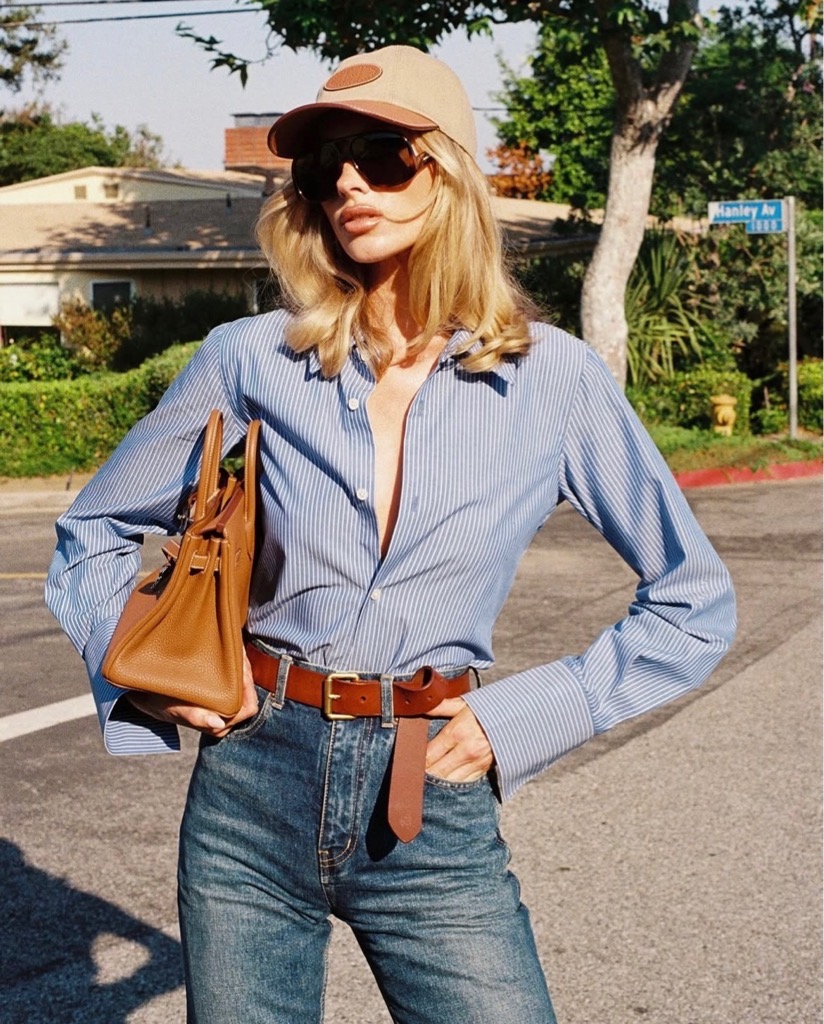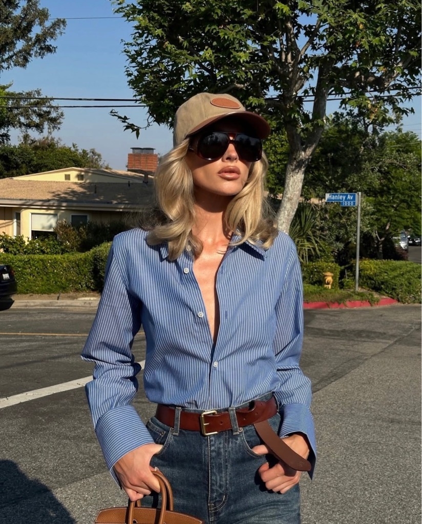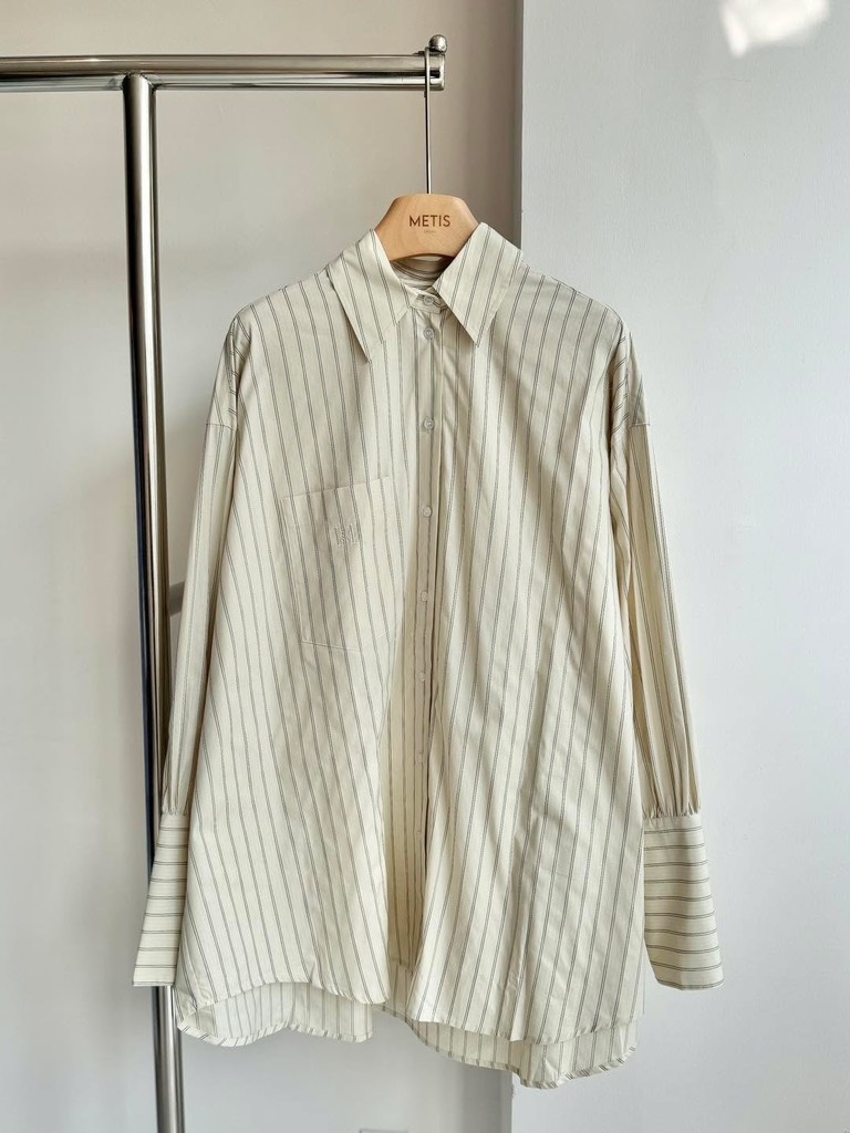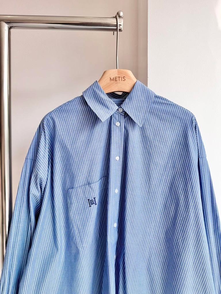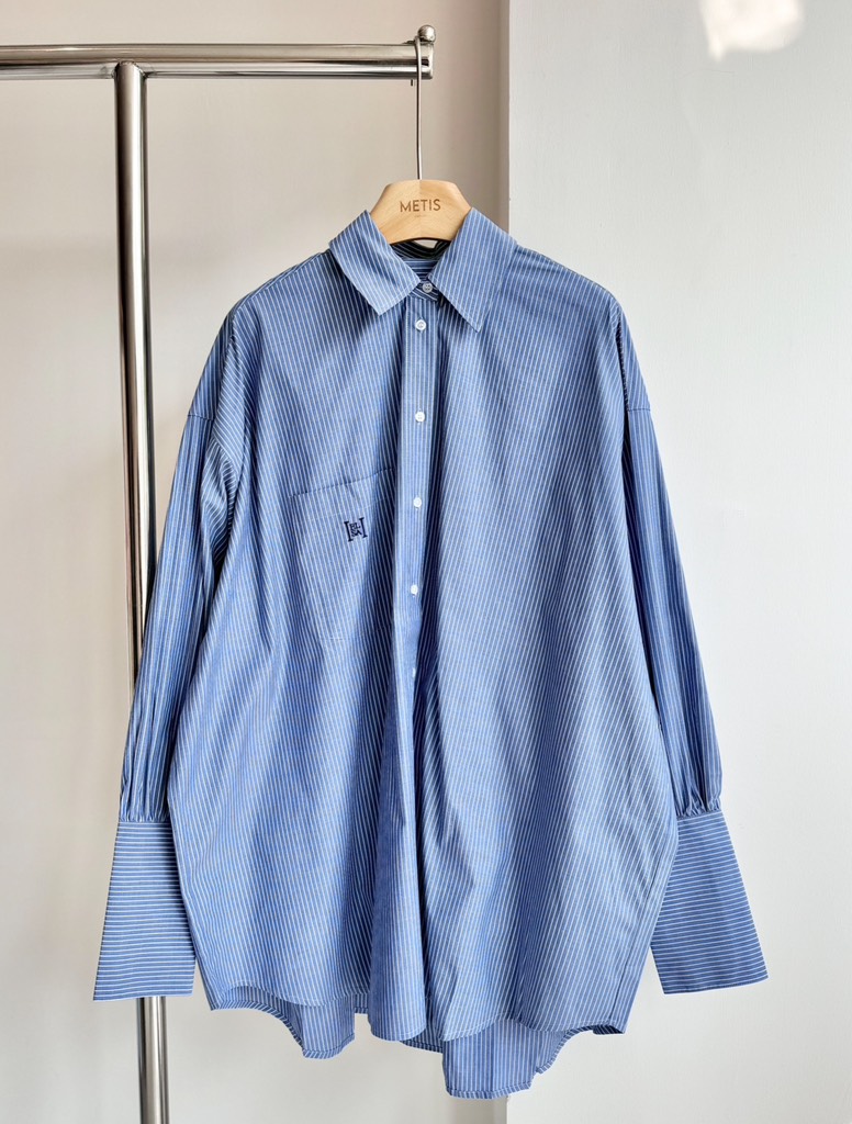 Sơ mi MAJE kẻ xanh thêu chữ đỏ