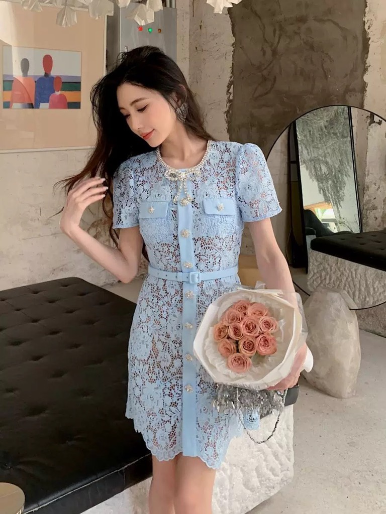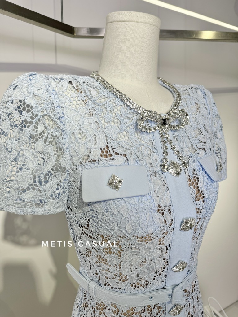 Váy SELF PORTRAIT xanh ngắn cổ nơ