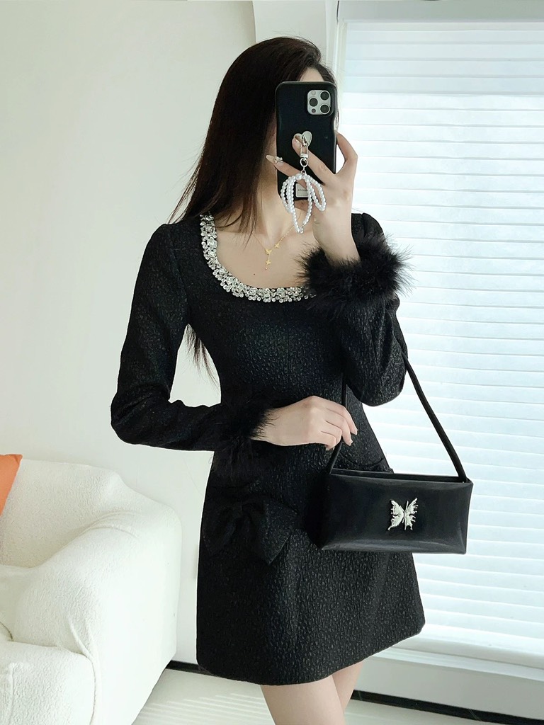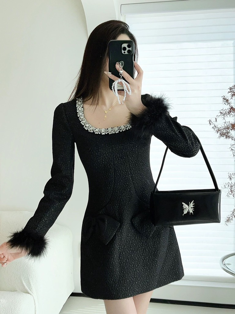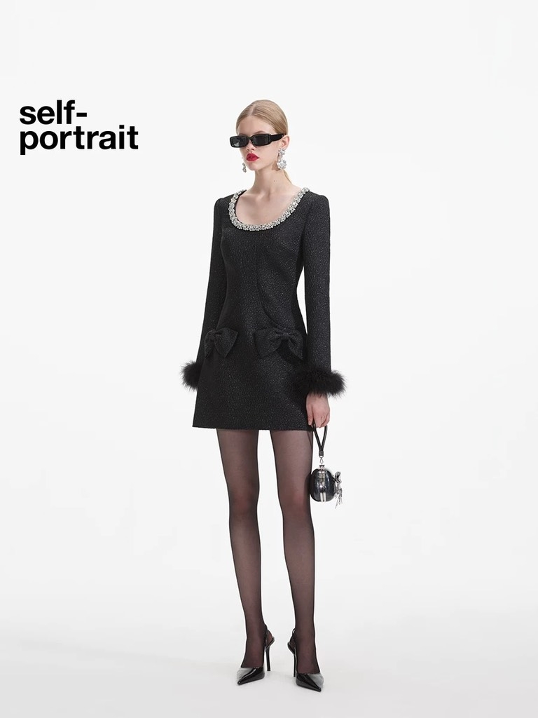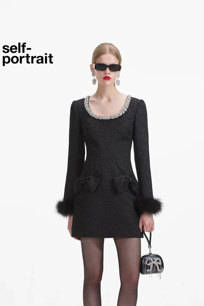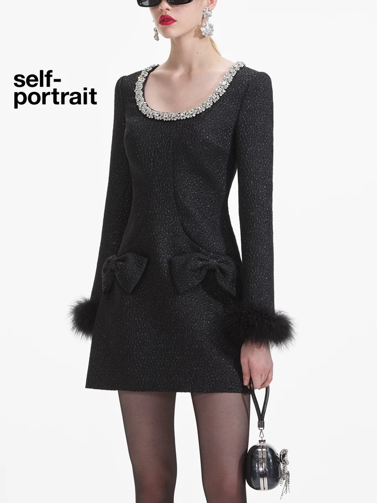 Váy SELF PORTRAIT tweed nơ tay lông