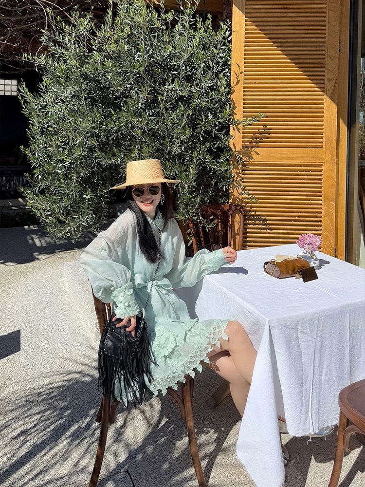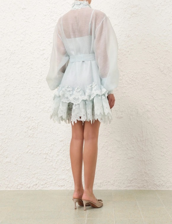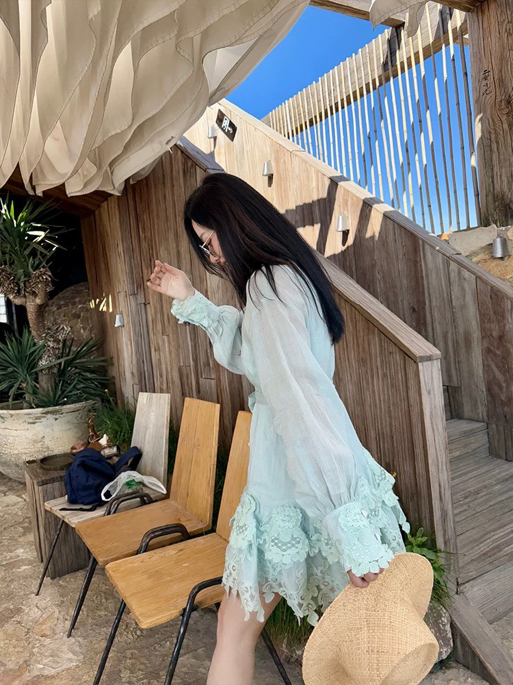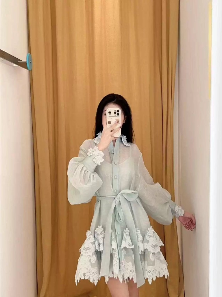 Váy SELF PORTRAIT cộc tay ren xanh hoa nổi